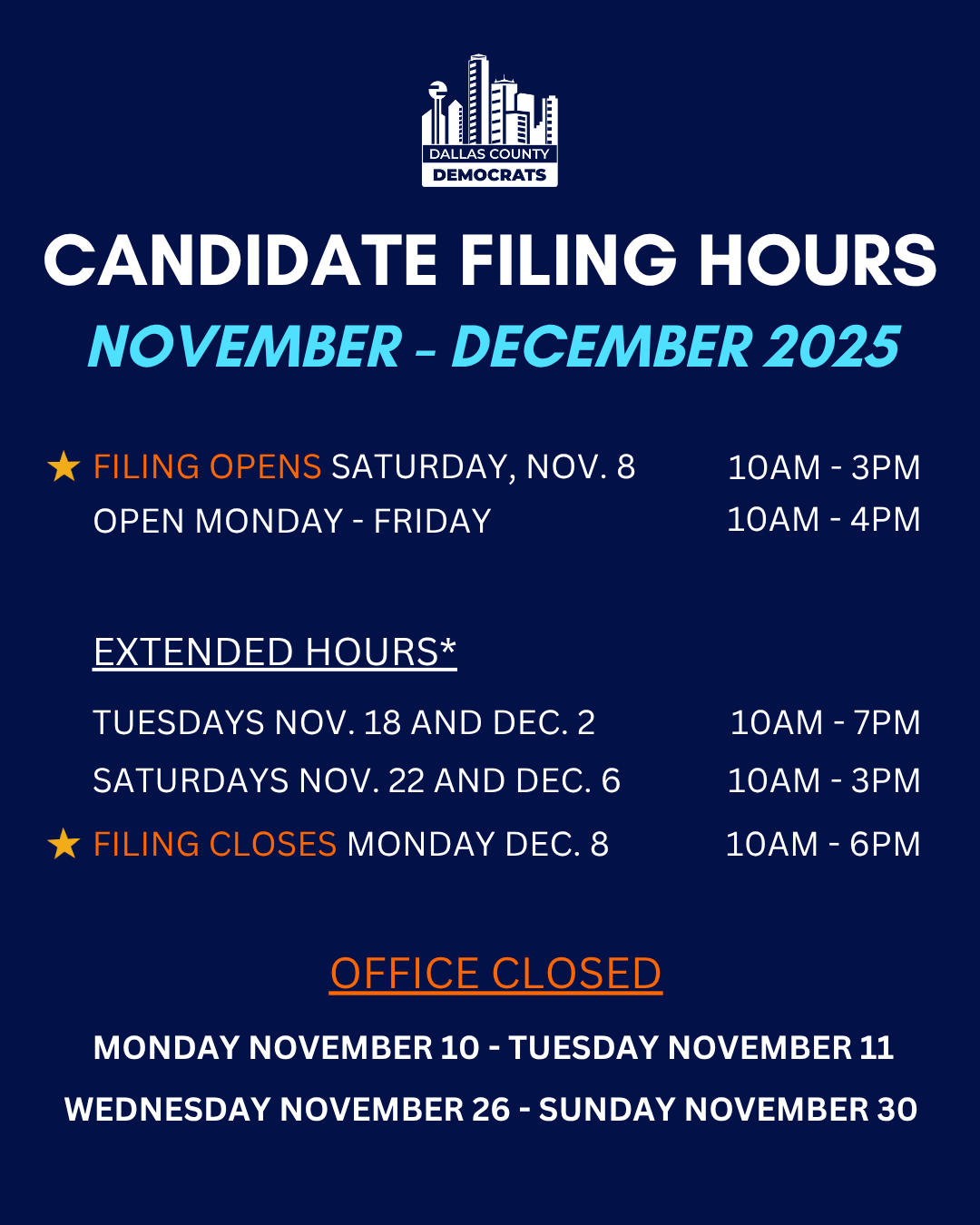 The filing period for candidates who wish to be on the ballot for the 2026 Democratic Primary is November 8, 2025 until 6:00 PM December 8, 2025. The filing period for Precinct Chairs is September 8, 2025 until 6:00 PM December 8, 2025. Candidates may file in person at the DCDP office (1414 N. Washington Avenue, Dallas 75204) during our regular business hours of 10:00 AM - 4:00 PM Monday through Friday, or during our extended hours on November 18, November 22, December 2, December 6, and December 8.